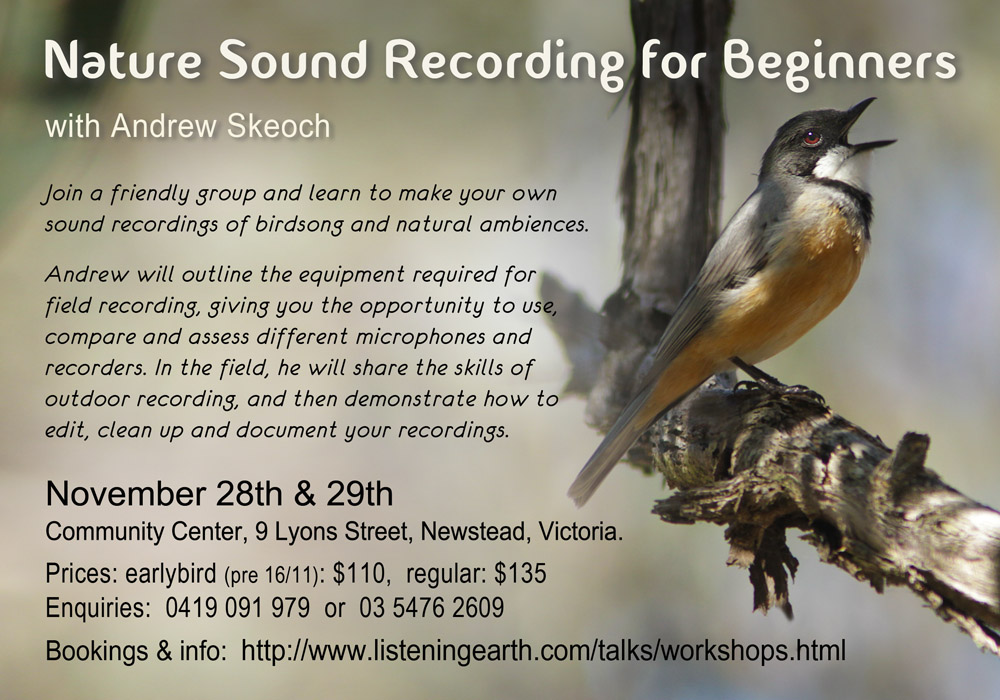 Andrew will outline the equipment required for field recording, both from a technical and hands-on perspective. We will then go out to natural bushland, giving you the opportunity to use, compare and assess different microphones and recorders. While there he will discuss field craft; the skills of how to hear the landscape and best record its many voices. Finally, Andrew will cover the studio aspects of sound editing, documentation, archiving, cleaning up and presenting your valuable recordings.